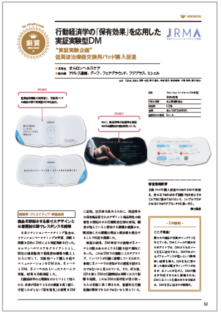 日本リテンション・マーケティング協会では、会員企業様参加企画として「実証実験企画」に、オムロンヘルスケア㈱様を実験主体としてお迎えし、2019年から取り組んで参りました。お陰様で各企業様のご協力により多くの知見を得ることが出来ました。その結果、本企画で使用したダイレクトメールが、日本郵便様主催の全日本DM大賞におきましてご評価いただき銅賞を受賞させて頂きました。今回は、実証実験結果を皆様と共有させて頂くと同時に、本企画にご参加頂いた各企業様からリテンション・マーケティングの未来について語っていただきます。
