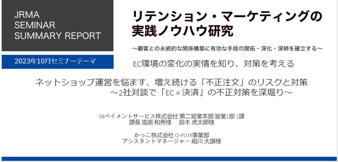 2023年10月定例会報告 ネットショップ運営を悩ます、増え続ける「不正注文」のリスクと対策 2023年12月4日 保泉繁夫 詳しくは下記フォームへご記入頂き、資料のダウンロードをお願いいたします。 ダウンロードフォームに必須項目を記載後、送信ボタンを押すと、資料ダウンロード用のURLをメールでご案内いたします。なお、フリーアドレスでお申し込みされる際は、受信制限などの設定を事前にご確認ください。ダウンロードの案内メールが届かない原因となります。 会社名*必須 お名前*必須 メールアドレス*必須 部署名*必須 役職 お電話番号*必須 会社URL*必須 アンケート リテンションマーケティング活動における貴社の状況・立場をお聞かせください。 現在取り組んでいる最中必要性を感じており、これから取り組みを検討中まだ情報収集の段階リテンションマーケティングを支援する立場 プライバシーポリシー*必須 プライバシーポリシーに同意します 【ご提供いただく個人情報のお取り扱いについて】 ●無料見学会の参加申込みに際して、以下の事項に同意されたものと見なします。 ●ご入力頂いた個人情報は、「日本リテンション・マーケティング協会」へ収集されます。 ●「日本リテンション・マーケティング協会」からのメールマガジン、電話、送付物による情報提供サービスを受け取ります。 ●提供された個人情報は、「日本リテンション・マーケティング協会」のプライバシーポリシー下で適切に取り扱われます。 お問合せ・資料請求には上記「個人情報のお取り扱いについて」への同意が必要です。内容をご確認の上、ご同意いただける場合「プライバシーポリシーに同意します」にチェックをして、「送信」ボタンをクリックしてください。