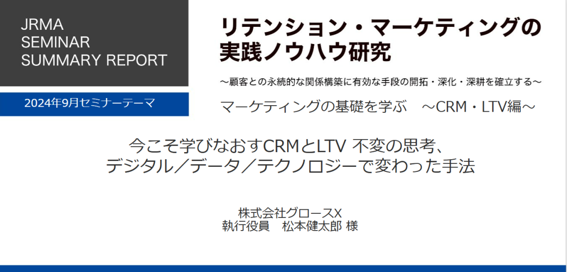 2024年9月定例会報告 マーケティングの基礎を学ぶ ~CRM・LTV編~ 2024年11月28日 保泉繁夫 詳しくは下記フォームへご記入頂き、資料のダウンロードをお願いいたします。 ダウンロードフォームに必須項目を記載後、送信ボタンを押すと、資料ダウンロード用のURLをメールでご案内いたします。なお、フリーアドレスでお申し込みされる際は、受信制限などの設定を事前にご確認ください。ダウンロードの案内メールが届かない原因となります。 会社名*必須 お名前*必須 メールアドレス*必須 部署名*必須 役職 お電話番号*必須 会社URL*必須 アンケート リテンションマーケティング活動における貴社の状況・立場をお聞かせください。 現在取り組んでいる最中必要性を感じており、これから取り組みを検討中まだ情報収集の段階リテンションマーケティングを支援する立場 プライバシーポリシー*必須 プライバシーポリシーに同意します 【ご提供いただく個人情報のお取り扱いについて】 ●無料見学会の参加申込みに際して、以下の事項に同意されたものと見なします。 ●ご入力頂いた個人情報は、「日本リテンション・マーケティング協会」へ収集されます。 ●「日本リテンション・マーケティング協会」からのメールマガジン、電話、送付物による情報提供サービスを受け取ります。 ●提供された個人情報は、「日本リテンション・マーケティング協会」のプライバシーポリシー下で適切に取り扱われます。 お問合せ・資料請求には上記「個人情報のお取り扱いについて」への同意が必要です。内容をご確認の上、ご同意いただける場合「プライバシーポリシーに同意します」にチェックをして、「送信」ボタンをクリックしてください。