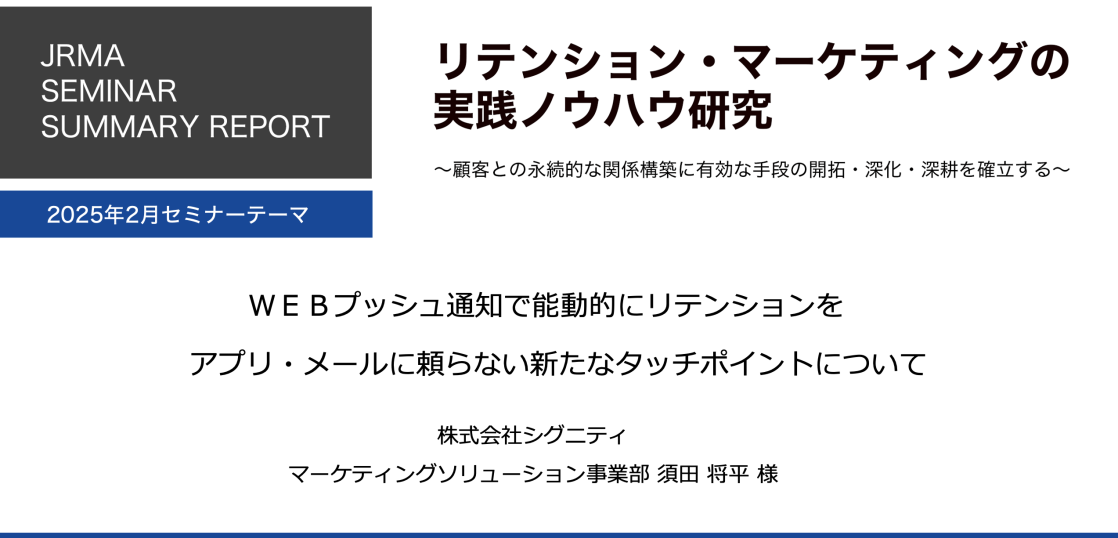 2025年2月定例会報告 WEBプッシュ通知で能動的にリテンションを 2025年4月14日 保泉繁夫 詳しくは下記フォームへご記入頂き、資料のダウンロードをお願いいたします。 ダウンロードフォームに必須項目を記載後、送信ボタンを押すと、資料ダウンロード用のURLをメールでご案内いたします。なお、フリーアドレスでお申し込みされる際は、受信制限などの設定を事前にご確認ください。ダウンロードの案内メールが届かない原因となります。 会社名*必須 お名前*必須 メールアドレス*必須 部署名*必須 役職 お電話番号*必須 会社URL*必須 アンケート リテンションマーケティング活動における貴社の状況・立場をお聞かせください。 現在取り組んでいる最中必要性を感じており、これから取り組みを検討中まだ情報収集の段階リテンションマーケティングを支援する立場 プライバシーポリシー*必須 プライバシーポリシーに同意します 【ご提供いただく個人情報のお取り扱いについて】 ●無料見学会の参加申込みに際して、以下の事項に同意されたものと見なします。 ●ご入力頂いた個人情報は、「日本リテンション・マーケティング協会」へ収集されます。 ●「日本リテンション・マーケティング協会」からのメールマガジン、電話、送付物による情報提供サービスを受け取ります。 ●提供された個人情報は、「日本リテンション・マーケティング協会」のプライバシーポリシー下で適切に取り扱われます。 お問合せ・資料請求には上記「個人情報のお取り扱いについて」への同意が必要です。内容をご確認の上、ご同意いただける場合「プライバシーポリシーに同意します」にチェックをして、「送信」ボタンをクリックしてください。
